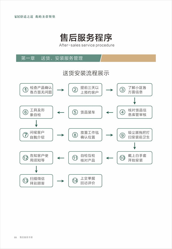 物資準(zhǔn)備:上門前必須著圣蒂斯堡統(tǒng)一工作服,佩戴工作證,準(zhǔn)備好安裝工具、搬抬工具(搬運(yùn)背帶等)、備件、筆記本、手套、鞋套、地墊、衛(wèi)生清掃工具(清潔劑、抹布、掃把簸箕、拖把、吸塵器等)、瓶裝水、《圣蒂斯堡安裝施工指示牌》、收據(jù)和圣蒂斯堡產(chǎn)品說(shuō)明書、《產(chǎn)品配送單》和《配送滿意度調(diào)查表》等物品。再帶上小禮品,例:鮮花或碳包去味禮包等。