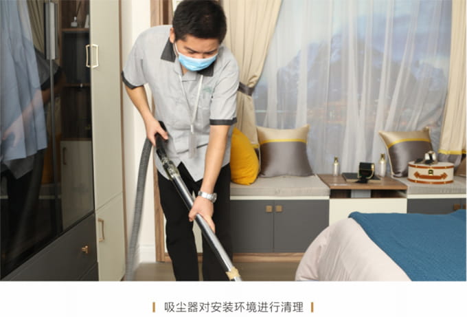 產(chǎn)品安裝確認(rèn)無(wú)誤后及時(shí)清理房間內(nèi)因安裝產(chǎn)生的垃圾并保持空氣流暢,然后用干凈的抹布將家具擦拭一遍,確保產(chǎn)品清潔,用吸塵器對(duì)安裝環(huán)境進(jìn)行清理,并對(duì)所有安裝好的產(chǎn)品拍攝記錄作為完工效果備案。