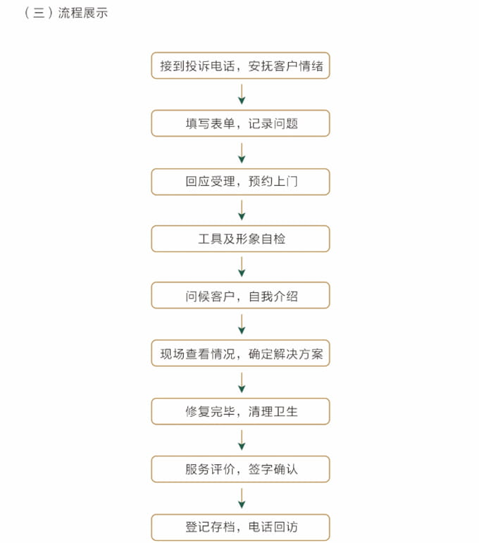 必須按照客戶約定,至少提前5分鐘上門,見(jiàn)到客戶時(shí)需自我介紹,并出示上崗證和名片,在進(jìn)入顧客家前應(yīng)穿上自備的鞋套。征得客戶同意后開(kāi)始維修,嚴(yán)禁亂收費(fèi)。