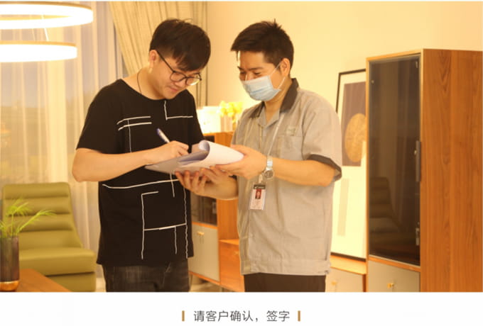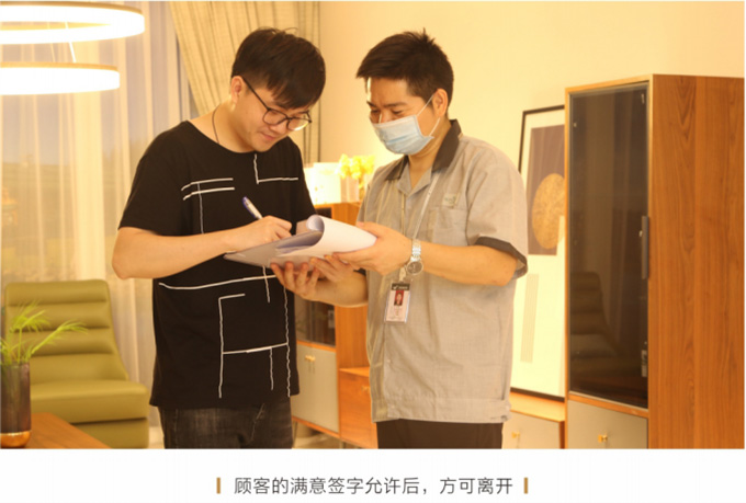 產(chǎn)品處理完畢后必須一站式通檢,指導(dǎo)客戶使用,并將服務(wù)過(guò)程中產(chǎn)生的垃圾隨手帶走,家具維修完畢后,應(yīng)用毛巾將家具擦拭一遍,確保產(chǎn)品清潔。
