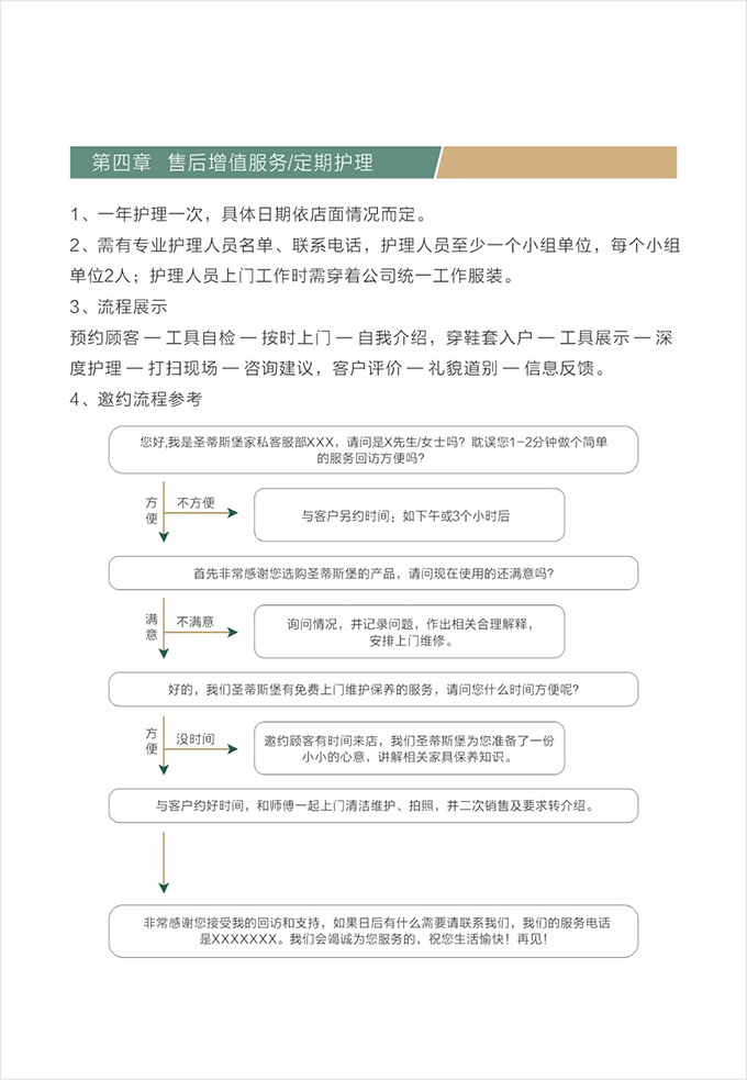 話術(shù)參考:“**先生/女士您好,我是圣蒂斯堡的售后服務(wù)人員**,您購(gòu)買的圣蒂斯堡家具已經(jīng)全部到貨了,送貨安裝大約需要**時(shí)間,請(qǐng)問(wèn)您這邊什么時(shí)候方便我們上門送貨安裝呢?”同時(shí)要了解送貨小區(qū)的電梯、樓道、入戶門的尺寸等,提前做好準(zhǔn)備,避免意外情況。最后確定送貨時(shí)間(安裝所需要時(shí)長(zhǎng)),并告知客戶安裝人員的相關(guān)信息,可加微信發(fā)送,并發(fā)送配送安裝流程說(shuō)明。
