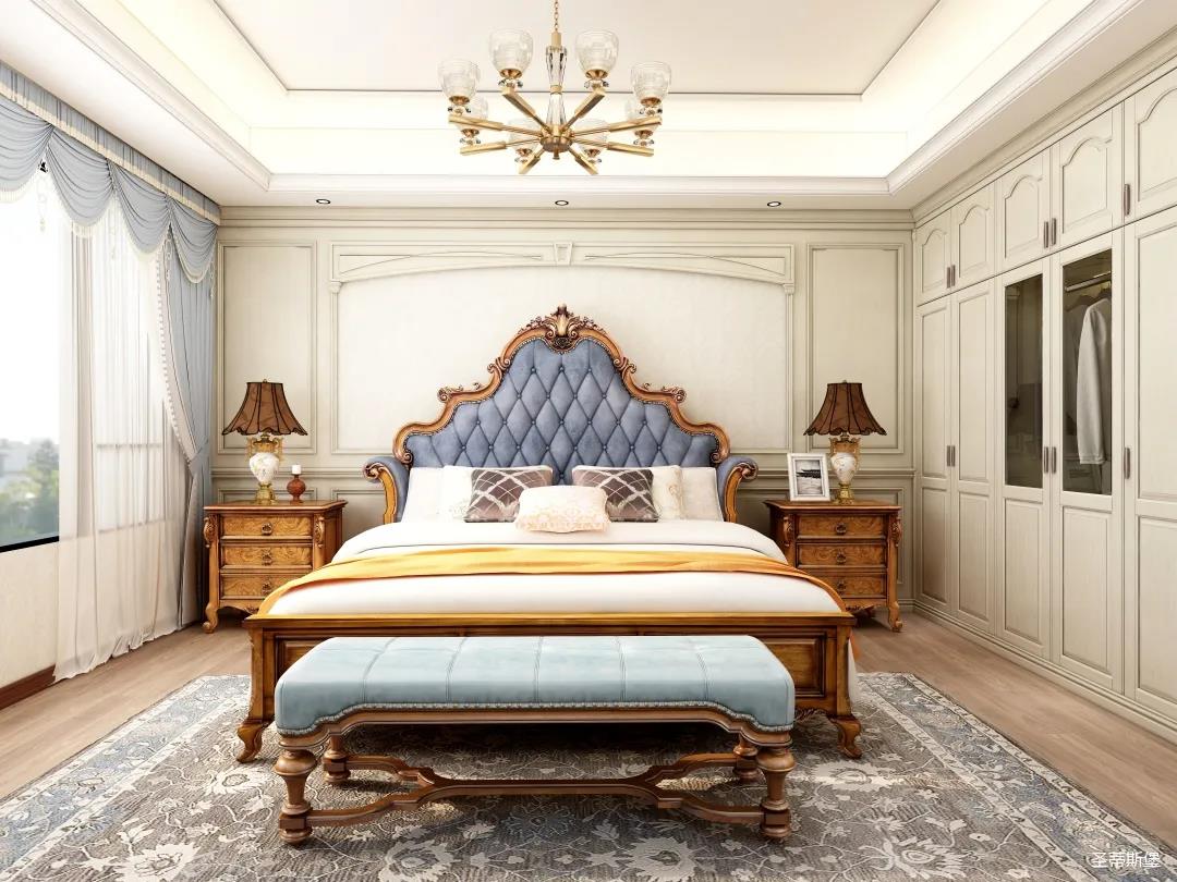 03主臥主臥設(shè)計運(yùn)用現(xiàn)代的設(shè)計手法和材質(zhì)還原了古典氣質(zhì),以干練的線條傳達(dá)著溫馨的臥房。蜿蜒的波紋曲線,細(xì)膩精致的雕花,猶如隨風(fēng)起伏的浪花,在清澈藍(lán)的床屏上跳躍,向靜態(tài)空間展示著活躍的動態(tài)效果。曲直線條完美融合,打造一個靈動而又精致的生活空間。