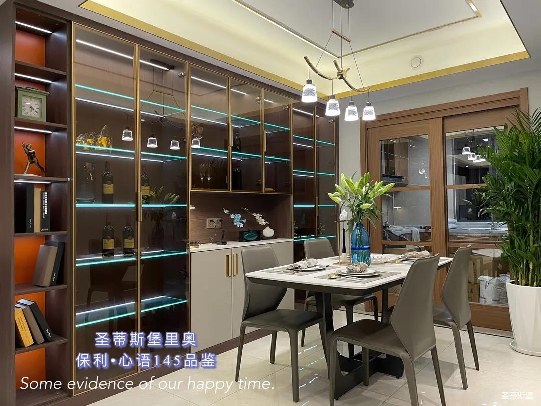 ▲餐廳一面及頂?shù)耐该鞴耋w,以簡練的金屬線條分割出收納空間,讓立面視覺更顯精致干凈。餐邊柜設(shè)置了臺面、全玻璃展示區(qū)以及隱藏收納區(qū),滿足了日常生活中多樣的收納需求。