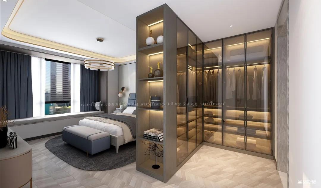 設(shè)計師不浪費每一寸空間,將主臥的大空間劃分出一個步入式的L型衣帽間,當(dāng)即隔斷了進(jìn)門對床的尷尬,滿足了我一直以來擁有獨立衣帽間的夢想,它不僅是個收納場所,更是臥室的質(zhì)感體現(xiàn)。