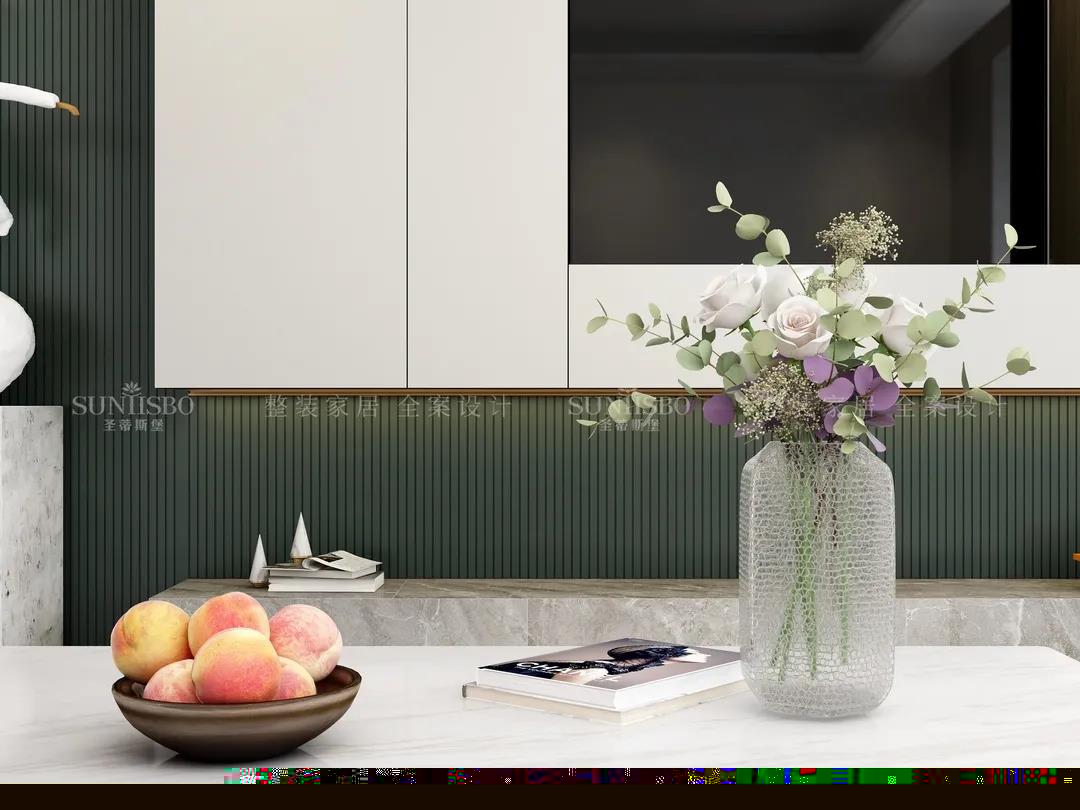 白綠搭配作為當(dāng)下時(shí)尚界的黑馬,一個(gè)沉著冷靜,一個(gè)高級(jí)清新,相互碰撞出前所未有的視覺享受。純白異型藝術(shù)雕塑是室內(nèi)和諧的體現(xiàn),也讓空間洋溢著趣味性。