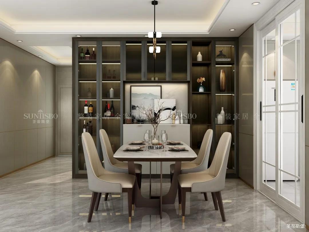 餐廳全開放式的布局,遵循了家具收納的28原則,20%的封閉式儲(chǔ)納,收納不常用的雜亂物品,80%的半開放設(shè)計(jì),展示軟裝飾物。餐邊柜將玻璃、金屬、實(shí)木材質(zhì)糅合分配,讓空間質(zhì)感倍增的同時(shí),也讓用餐空間多了一份家的溫度。