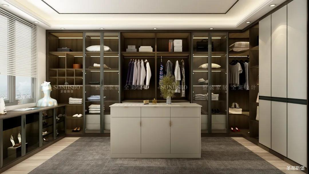 衣帽間采用了虛實(shí)結(jié)合的設(shè)計(jì),構(gòu)筑起規(guī)整而有序的置物區(qū)域和功能齊全的收納系統(tǒng),煙熏色實(shí)木作為空間的主要元素,環(huán)抱著整個(gè)衣帽間,張揚(yáng)又不失沉穩(wěn),恰到好處地搭配金屬玻璃置頂高門和感應(yīng)燈光系統(tǒng),挑高了空間效果,也詮釋著現(xiàn)代極簡線條美感和對(duì)極致的生活追求。