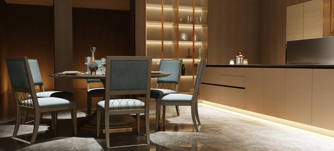 餐廚的極簡也可兼具多元,以一字內嵌式展開的廚區(qū)收納柜,兼顧了從杯具、調料等廚用材料收納到廚電歸置動線功能處理。在展示區(qū)域,玻璃隔板組合實木定制柜的表現(xiàn)形式,更是提升了空間的明亮度與寬闊感。