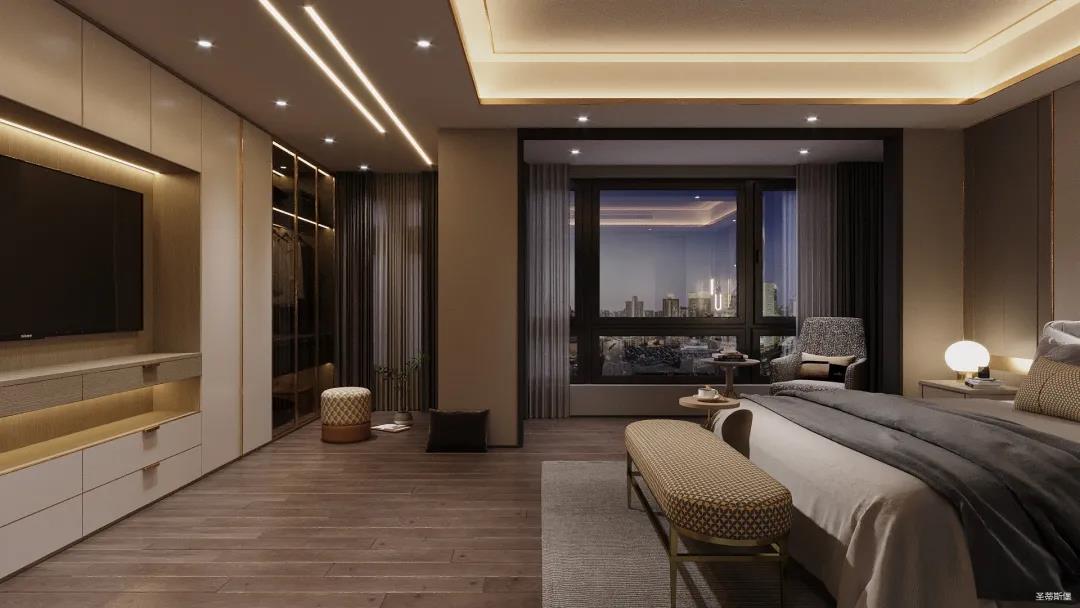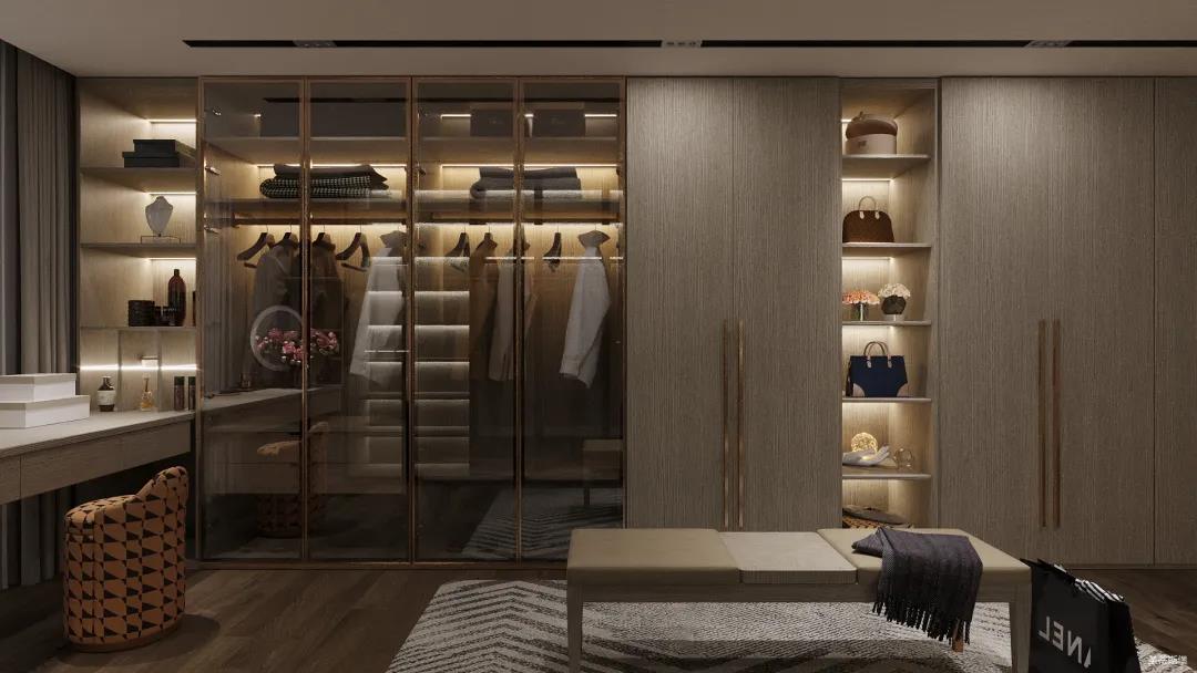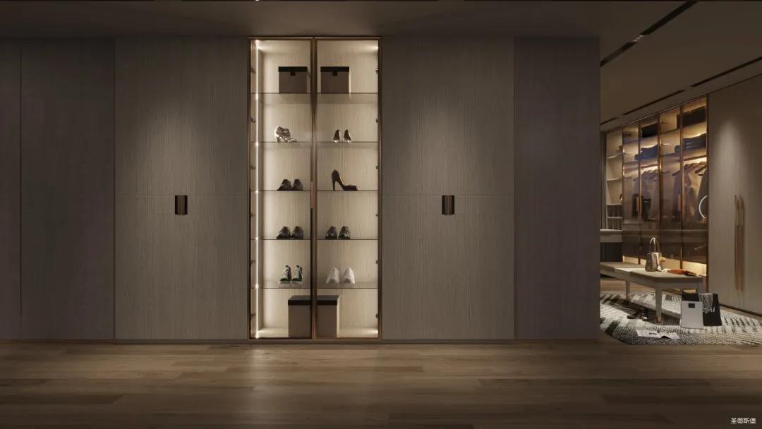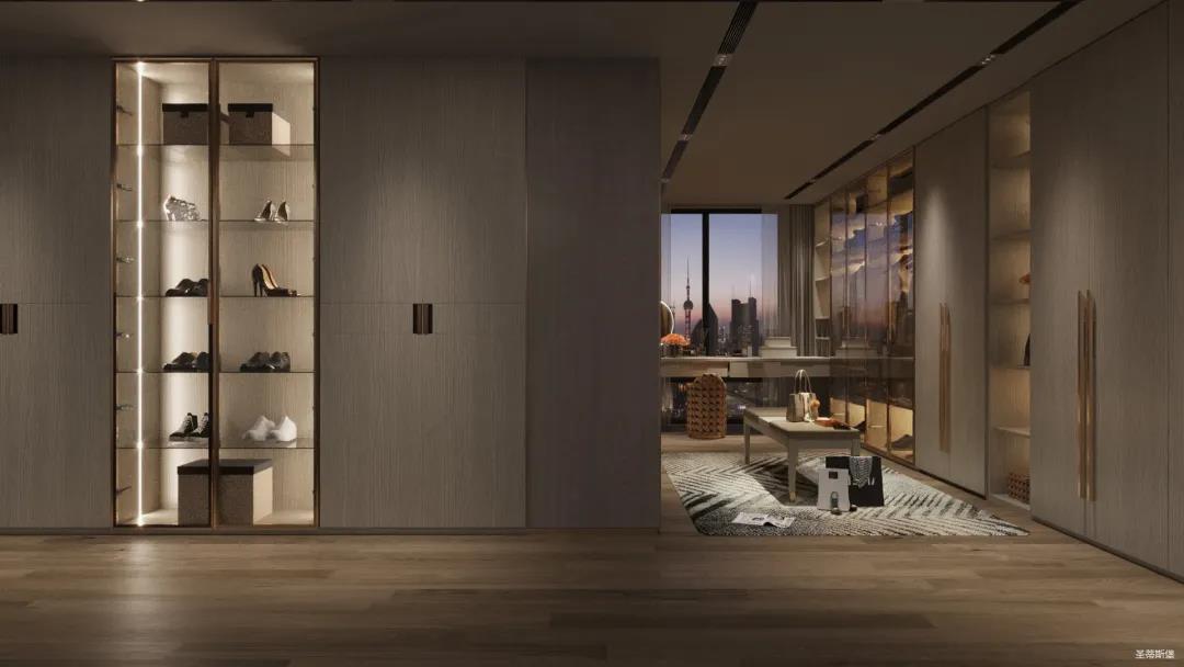 移步衣帽間,精簡華麗幾乎貫穿了整個空間,質感高級的實木定制柜框架、通透明亮的玻璃展示區(qū)、色調醇厚的金屬鑲邊,每一項細節(jié)搭配都在強調著業(yè)主的高端品位。妝臺前的落地窗讓我們在觀賞都市繁華的同時也屏蔽了都市喧囂,讓我們置身于繁華都市中有一處寧靜休憩地。