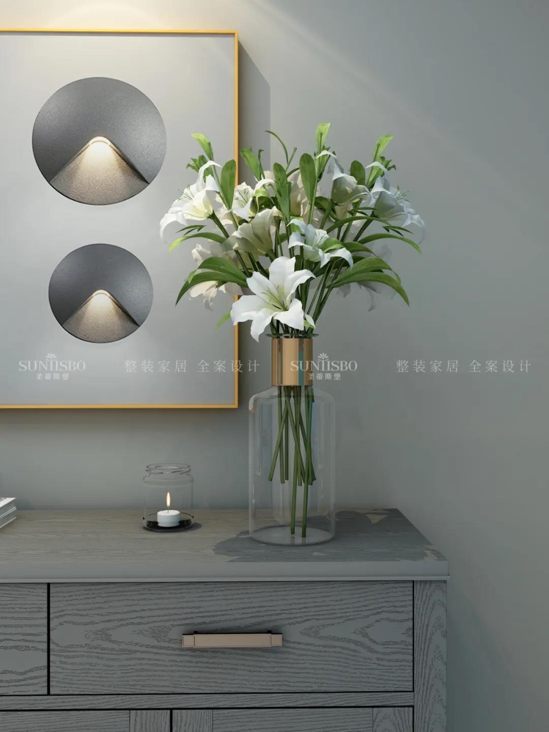 入戶(hù)側(cè)面設(shè)計(jì)一字型玄關(guān),腰部,底部留空做層板,便于隨手放置鑰匙、鞋包等物品,中間留空設(shè)計(jì)為開(kāi)放展示區(qū),加上軟裝飾品點(diǎn)綴,達(dá)到業(yè)主對(duì)品質(zhì)生活追求的理想狀態(tài)。應(yīng)女主人要求,玄關(guān)還加長(zhǎng)延伸出妝鏡和換鞋凳,讓動(dòng)線(xiàn)自然流暢。