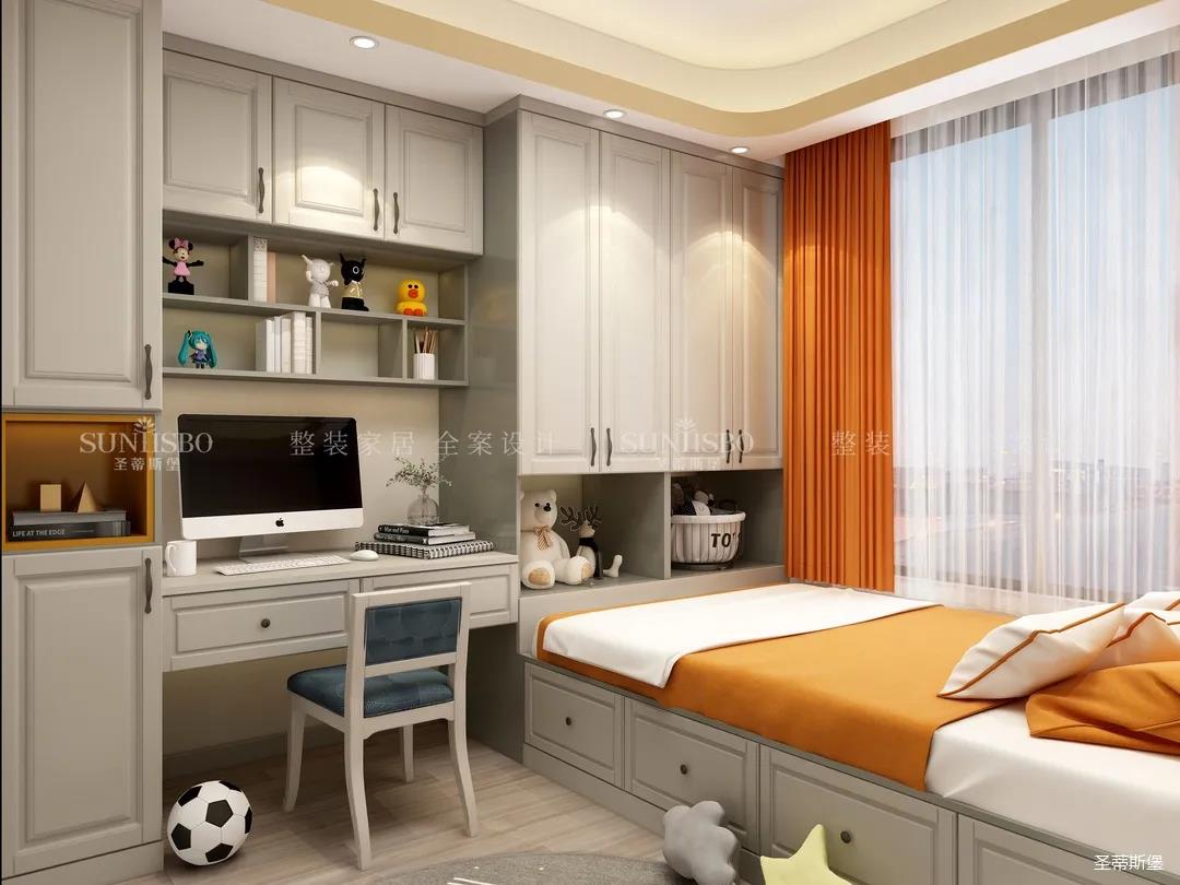 為給小朋友提供良好的居住環(huán)境,兒童房功能一應(yīng)俱全,兼具開(kāi)放式與封閉收納,將兒童的學(xué)習(xí)區(qū)與休息區(qū)合理劃分,打造了一個(gè)良好的生活習(xí)性,仿古白的整體柜,巧妙的將明亮橙作為撞色,令空間充滿(mǎn)童趣與活力。