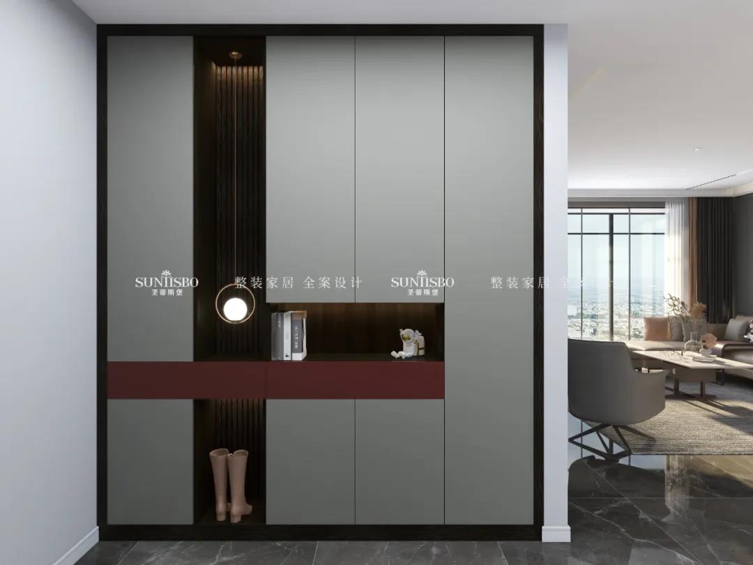 灰色平板門和煙熏色柜體做深淺搭配,搭配深灰鋁框門,整體簡單又大氣,再點(diǎn)綴一抹赤紅色,點(diǎn)亮了整個空間。