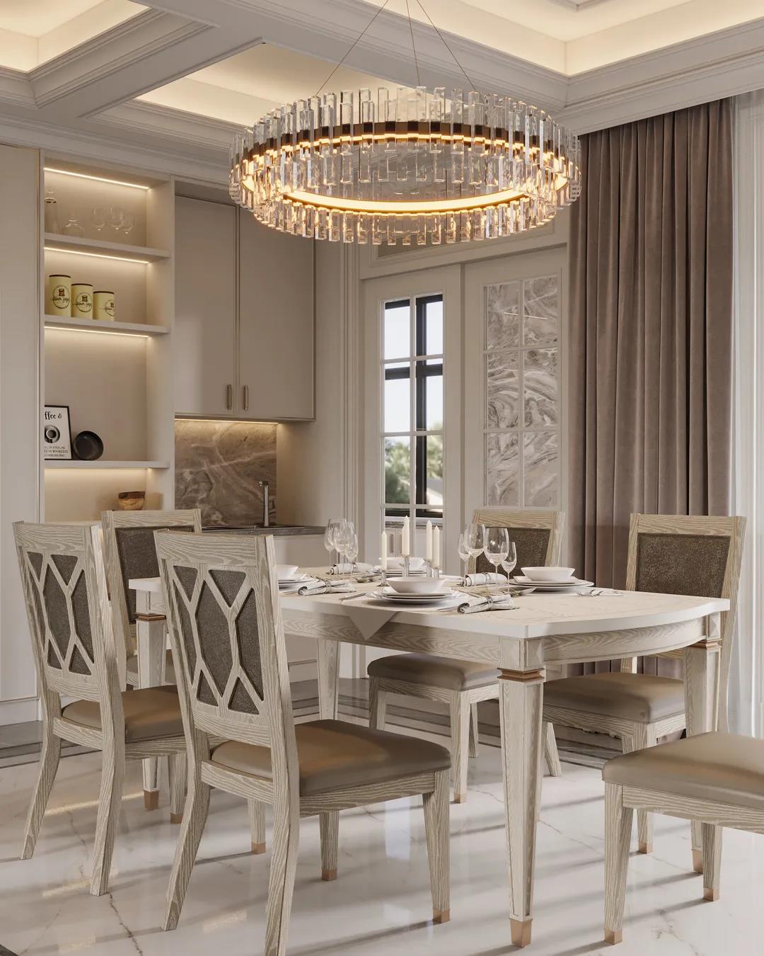 在華麗而精致的餐廳中,仿古白的餐桌椅搭配通透的水晶高腳杯,兩者交相輝映,用餐儀式感十足。墻面的護(hù)墻板和酒柜呈現(xiàn)一字型設(shè)計,一方面增添空間整體的豐盈感,還強(qiáng)調(diào)出個性現(xiàn)代的輕奢布局。