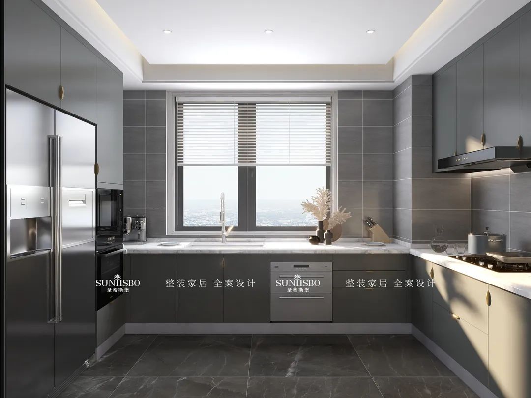 餐廳的設(shè)計(jì)采用整墻定制的餐邊柜,高級(jí)灰讓空間調(diào)性瞬間得到提升,半透明的玻璃展示區(qū),營(yíng)造了多樣的空間和充滿極簡(jiǎn)藝術(shù)氣息的生活體驗(yàn)。