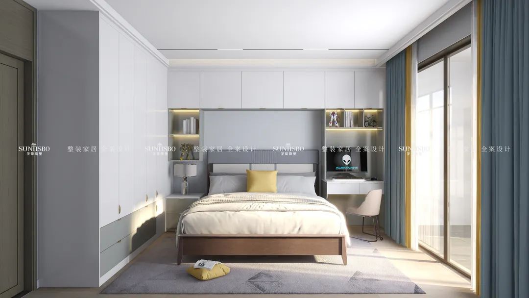 原色的木地板、淺灰的衣柜,搭配簡(jiǎn)約的背景墻,整個(gè)空間都呈現(xiàn)著祥和靜謐的氛圍。游走的光影,絕佳的開(kāi)闊視野,使得空間充滿無(wú)限張力。黃綠拼接的窗簾,配合柔和的層板燈,營(yíng)造舒適溫馨的起居氛圍。